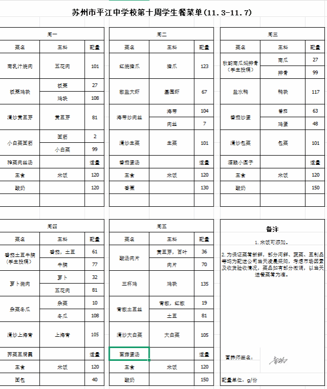 第十周(11.3-11.7)学生餐菜单