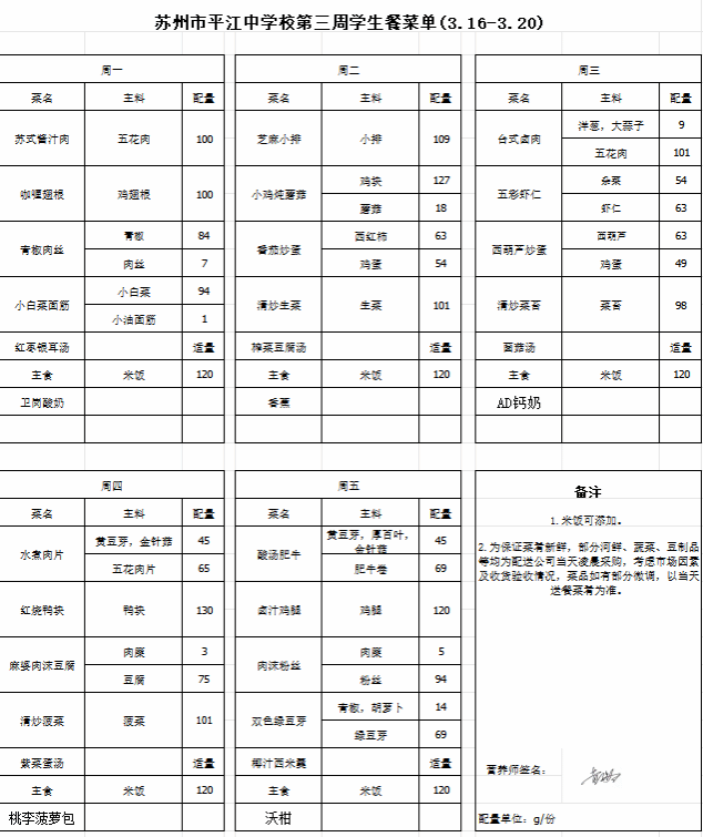 第三周(3.16-3.20)学生餐菜单