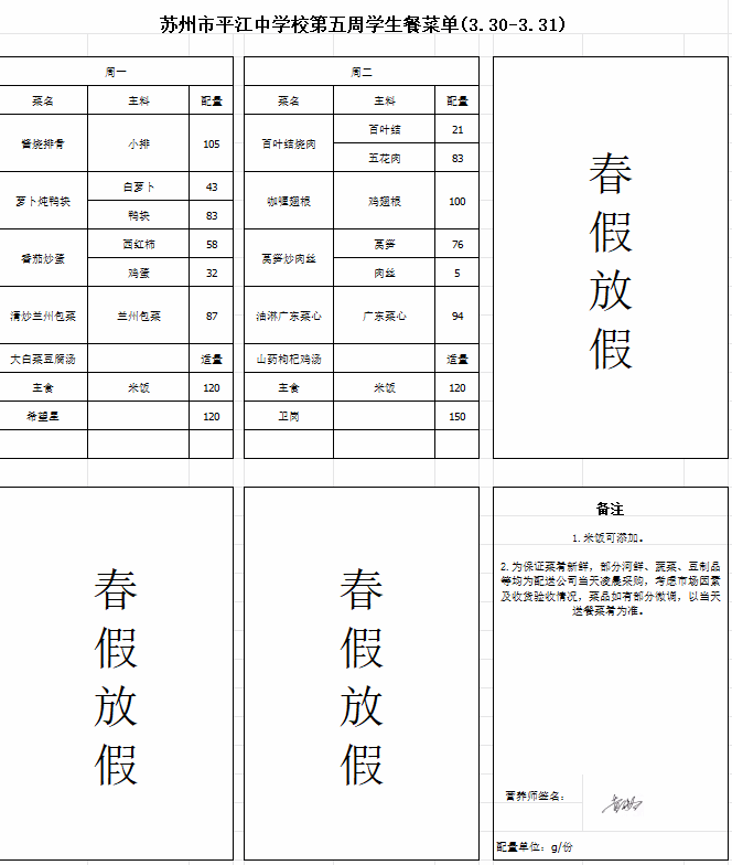 第五周(3.30-3.31)学生餐菜单