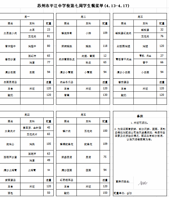 第七周(4.13-4.17)学生餐菜单